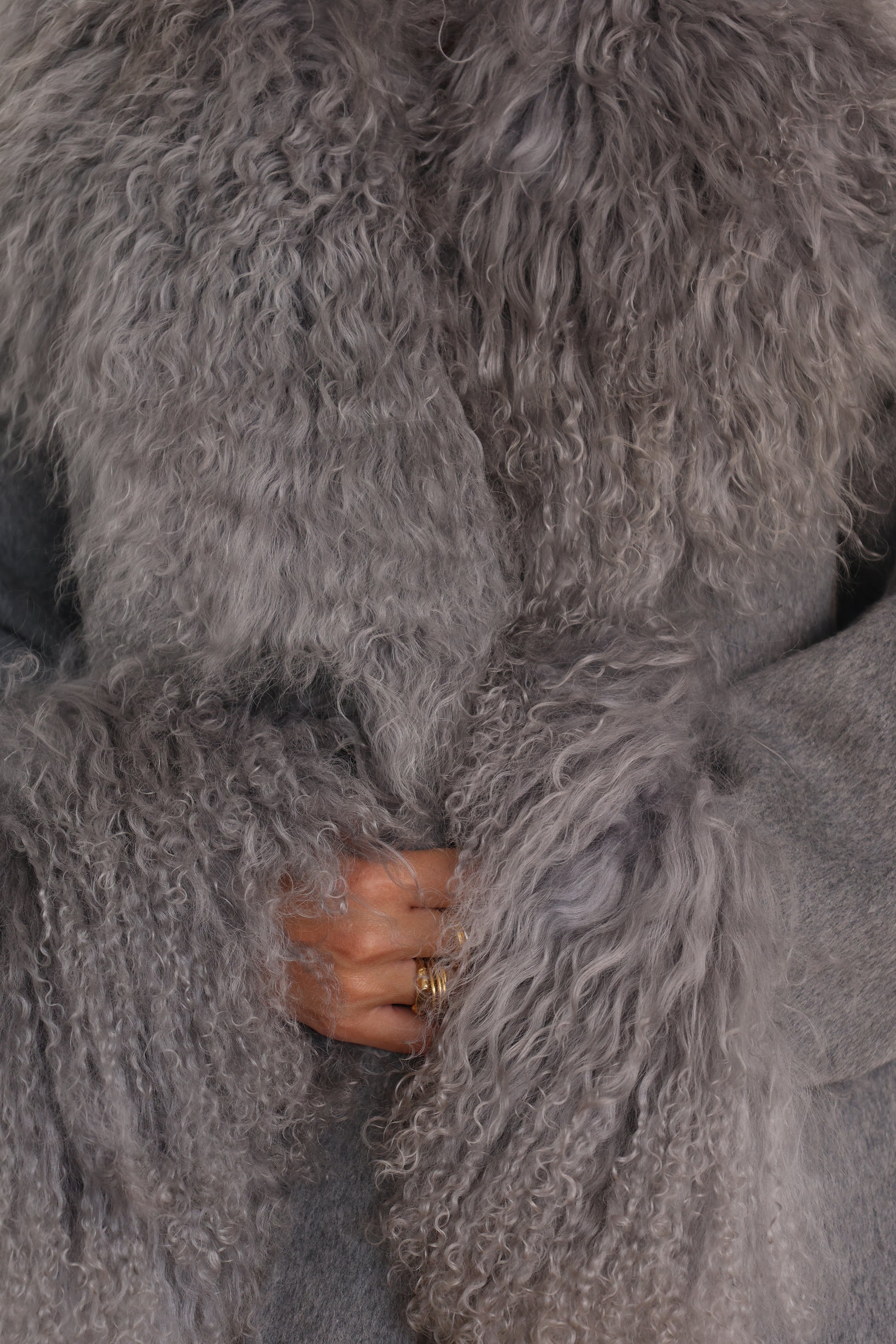 Grey wool coat, featuring luxurious mongolian fur on the collar and removable cuffs