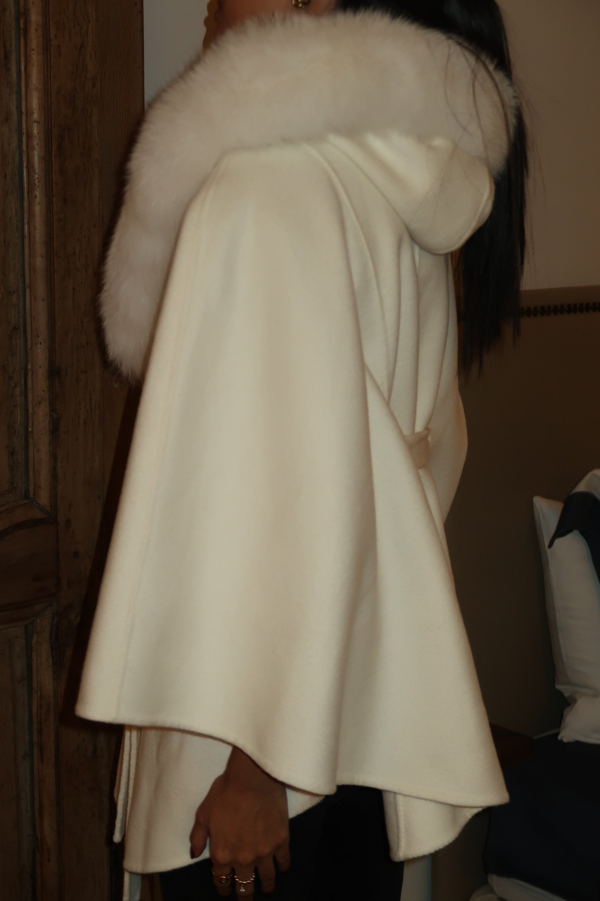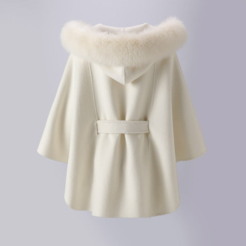 This coat, named "La Cape," is a luxurious combination of fox fur and wool. The design features :