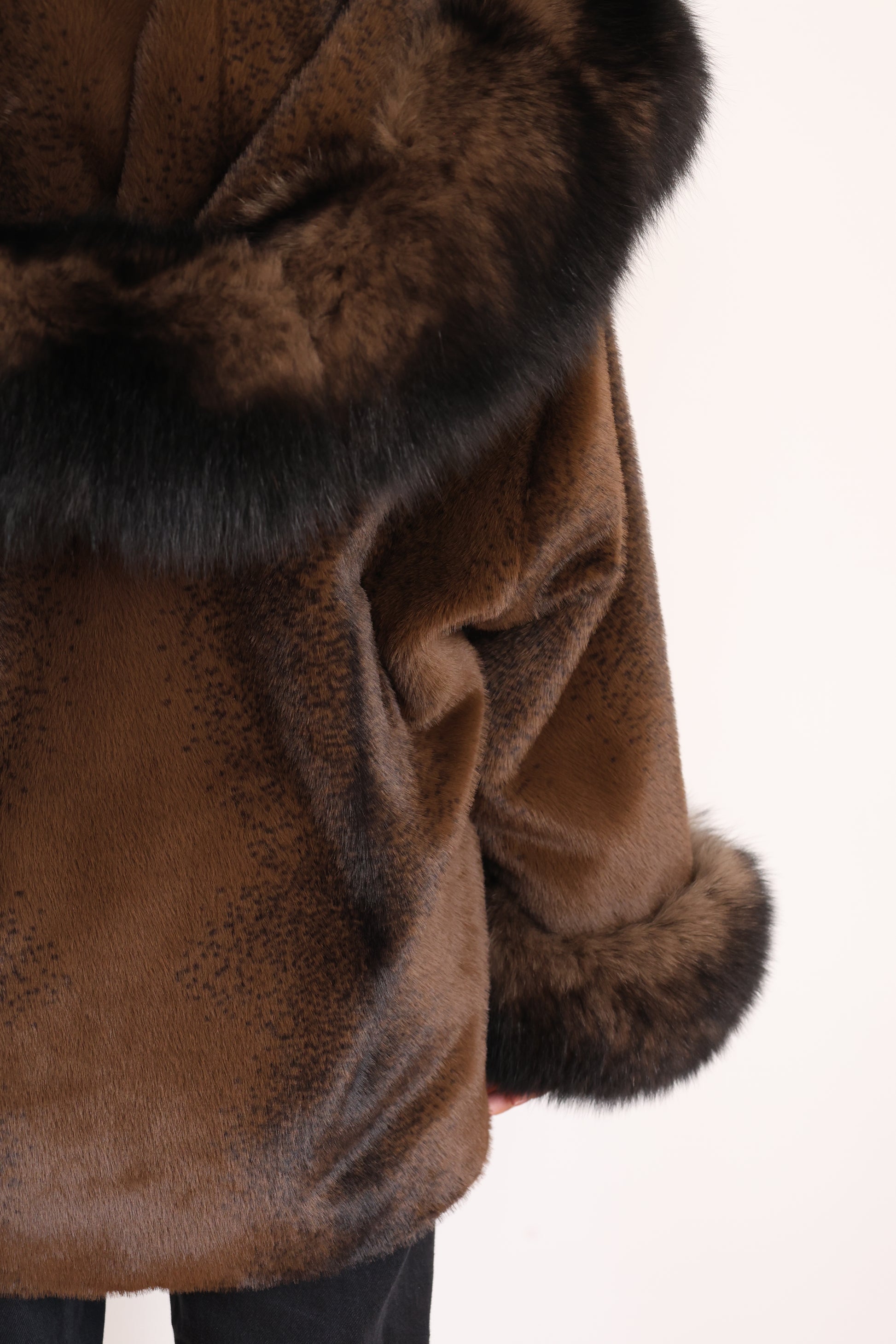 This elegant pink coat is made from soft Alcantara with luxurious fox fur on the collar and cuffs. With a flattering belted waist, it’s cozy, stylish, and perfect for winter.